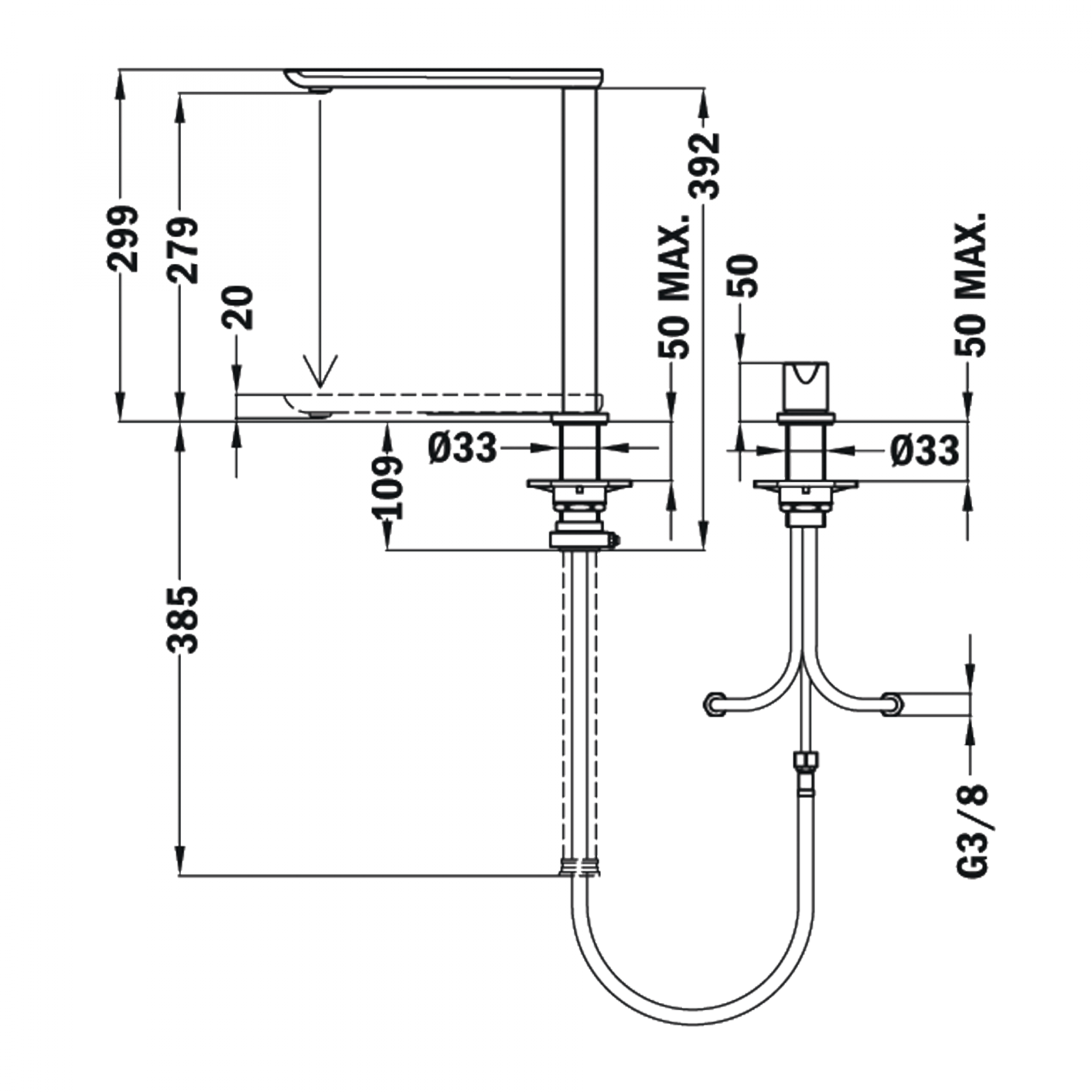 Височина в прибрано/извадено положение: 20/299 мм